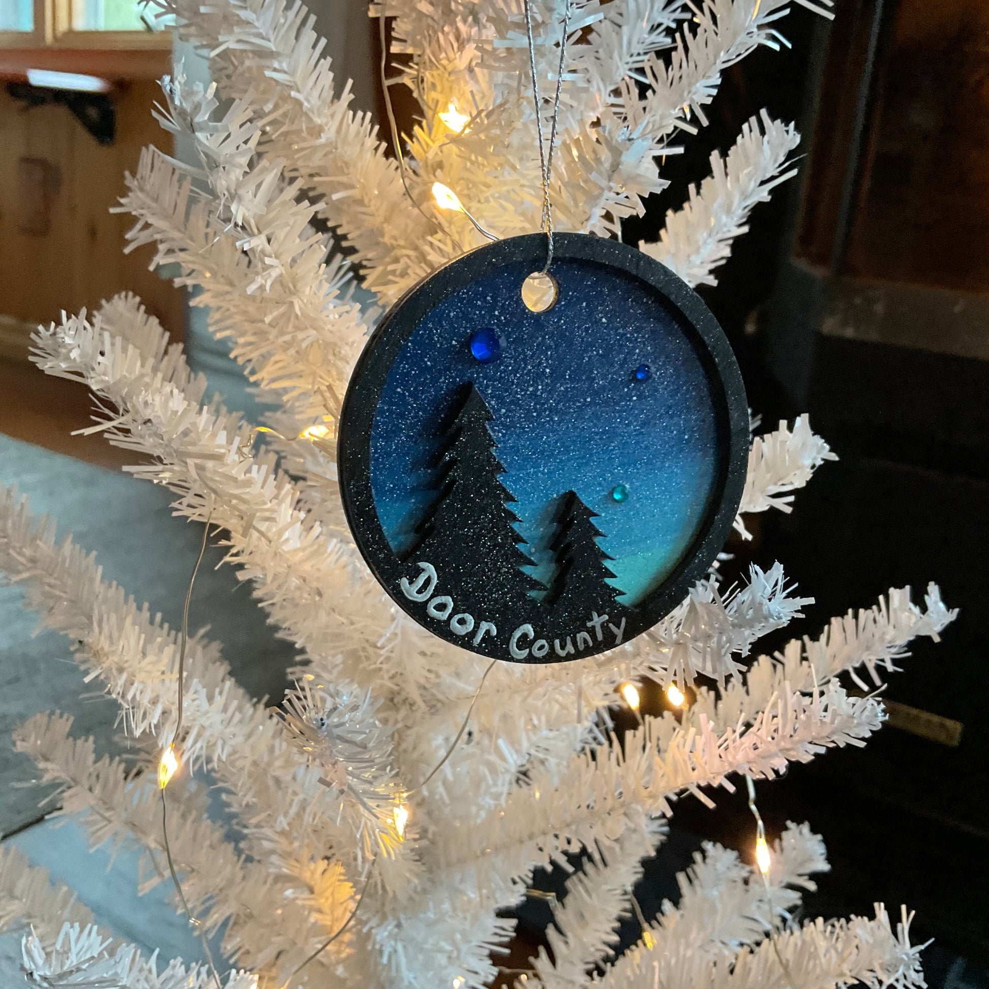 A gorgeous handmade ornament for the night sky lovers. Layered with a silhouette of trees, this ornament also sparkles.