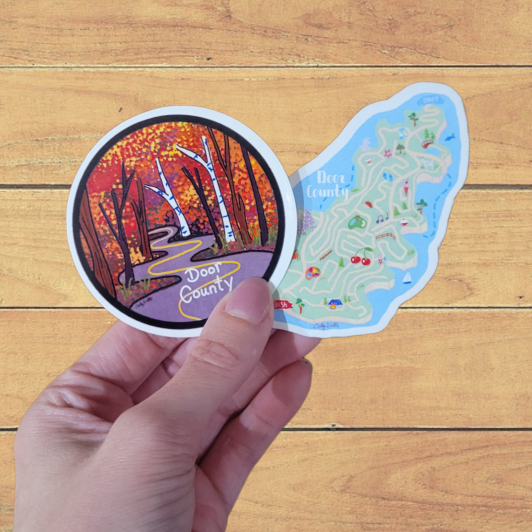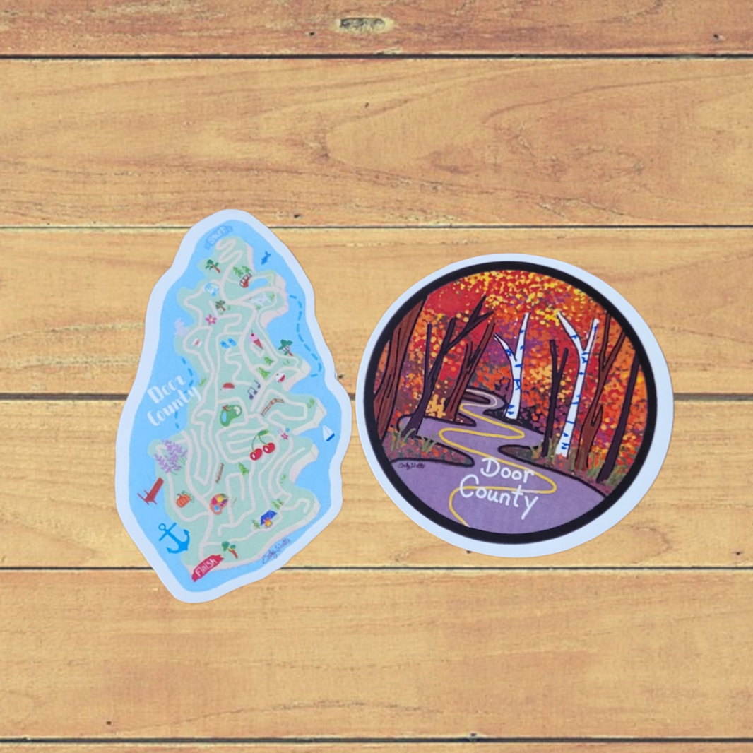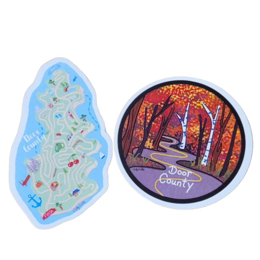 Stickers are so much fun, especially when they're jumbo-sized! This pack of 2 handmade stickers showcases some of our most popular designs. The Curvy Road sticker is just under 3 inches tall, and the Door County Maze sticker is about 3.5 inches at its longest points. Extra fun: the maze sticker is a real maze, which was created by Emily! The Curvy Road is also a real place you can visit in Wisconsin.
